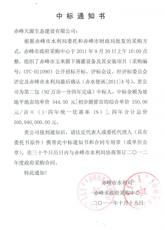 赤峰市政府采購中心于2011年9月30日,組織了赤峰市玉米膜下滴灌設(shè)備及其安裝項(xiàng)目招標(biāo)會(huì)議。經(jīng)評標(biāo)委員會(huì)評定及赤峰市水利局最后確認(rèn),赤峰天源生態(tài)建設(shè)有限公司為第二包中標(biāo)人,中標(biāo)總金額合計(jì)5億元。