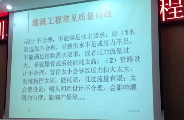 黃宗壁(北京農(nóng)業(yè)大學(xué)正教授)從灌溉工程項(xiàng)目管理的獨(dú)特性、工程項(xiàng)目管理規(guī)劃內(nèi)容、施工組織設(shè)計(jì)的編制方法(設(shè)計(jì)案例)進(jìn)行了講解與分析。例如灌溉工程常見的質(zhì)量問題1)水泵選取不合理導(dǎo)致供水不足或壓力不足,不能滿足植物需水要求;2)管道設(shè)計(jì)不合理,管徑大小會(huì)導(dǎo)致壓力損失太大;3)材料選擇錯(cuò)誤。